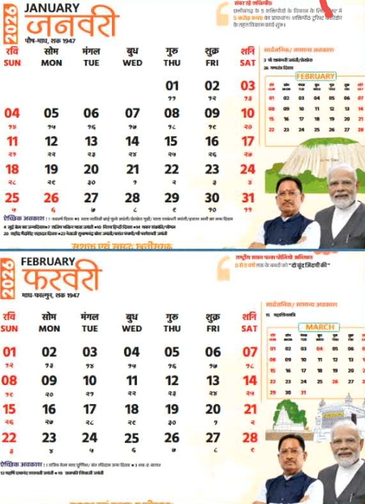 छत्तीसगढ़: छत्तीसगढ़ की राजधानी रायपुर स्थित मुख्यमंत्री निवास में सीएम साय द्वारा वर्ष 2026 के शासकीय कैलेंडर का विमोचन किया गया। कैलेंडर विमोचन कार्यक्रम में उपमुख्यमंत्री विजय शर्मा, कैबिनेट मंत्री राजेश अग्रवाल, मुख्यमंत्री के सचिव राहुल भगत और आयुक्त जनसंपर्क रवि मित्तल प्रमुख रूप से उपस्थित रहे। राज्य सरकार ने वर्ष 2026 को ‘महतारी गौरव वर्ष’ के रूप में मनाने का निर्णय लिया है जिसके थीम पर इस कैलेंडर को तैयार किया गया है। कैलेंडर का थीम सशक्त और समृद्ध छत्तीसगढ़ के संकल्प को प्रदर्शित करता है।